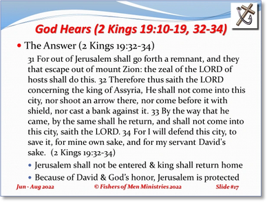 So now, Sennacherib, it is no longer your battle between you and my chosen, Hezekiah. Rather, it is battle between you and your forces of evil, against Me and My forces of good. Hence, the battle is over before it starts. And as God has done so many time – Thus it was spoken, thus it was written, and thus it shall be accomplished under the hand of God. History proves God’s words where carried out just as he said it. Assyria was denied victory, denied presence and denied even a single arrow’s trajectory over God’s city.