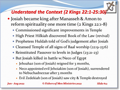 Josiah reinstituted the celebration of Passover, immediately, at levels not seem in Israel since the time of the Judges, that is, prior to Israel’s rejection of theocracy (2 Kings 23:21-23). As promised by Huldah, Josiah was killed in battle by Neco of Egypt before any of God’s judgment on Israel began. Jehoahaz was one of Josiah’s son’s and became king after him, but only reigned for three months. So, Neco appointed another evil son of Josiah, Jehoiakim, and he, in turn, reigned only 3 months before surrendering Judah to Nebuchadnezzar of Babylon. Zedekiah, a third evil son of Josiah served as king for eleven years and saw the complete destruction of Jerusalem and the great Temple (2 Kings 25).