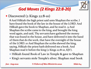 While the High Priest, Hilkiah was leading the efforts to repair the Temple, he discovered a Book of the Law (22:8 & 2 Chron 34:14). Adam Clark’s Commentary supposes that he found Deuteronomy 28-31. Recall these were the last instructions to Israel as they prepared to cross the Jordan and begin taking God’s promised land. Hilkiak showed the Book to Shaphan the Scribe, and documented that Shaphan actually read the Book and later read it aloud to Josiah and others (2 Kings 22:10). The reading of the Word caused Josiah to rip his clothes and ignited a national revival (vs. 11).