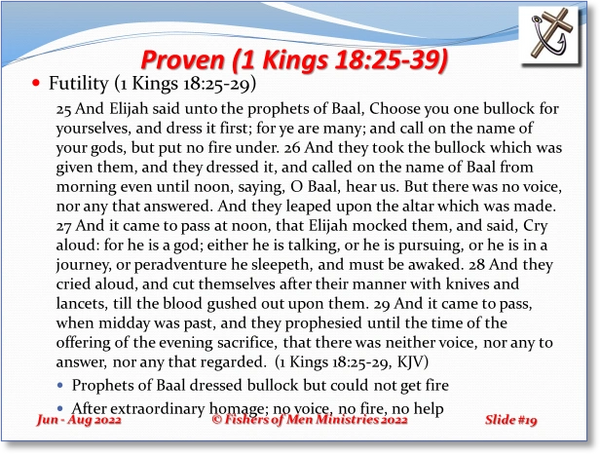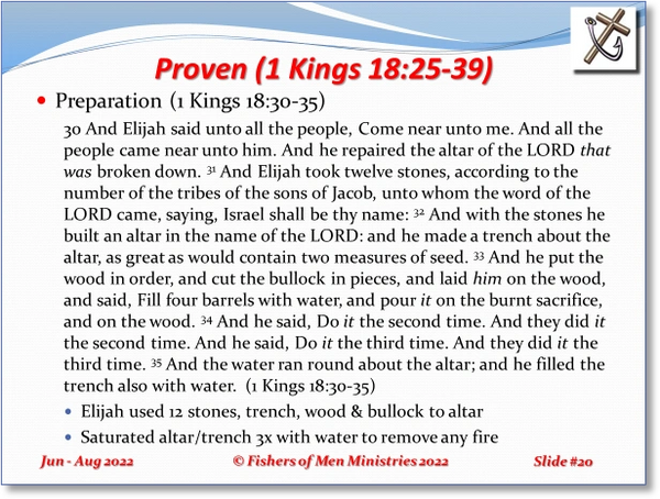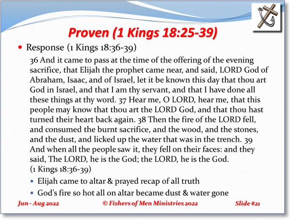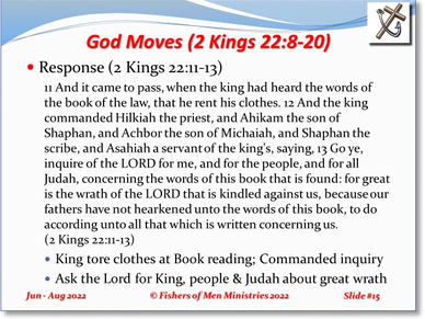When the king heard the words of Book Shaphan read, he was moved emotionally and spiritually by the clarity of God’s wrath against Judah. Deuteronomy 31:14 begins a section of Scripture which predicts the disobedience of Israel even before He led them into the land He promised them. Then, it documents God’s response in wrath against them. It details Israel’s worship of foreign gods, the gods of the people in the lands God had told them to reject and totally destroy. It provides the details of their sacrifices to foreign gods. It details God’s response with wrath on all those who rejected Him. And then, verse 31:26 says, “Take this Book of Instruction and place it beside the Ark of the Covenant of the LORD your God, so it may remain there as a witness against the people of Israel.” There is where the High Priest had found the Book; waiting for just a time such as this.