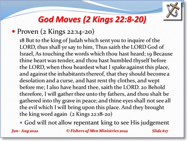 So, Josiah’s fear that there was a severe judgment from God on the way to Judah was correct. His drive to repent and tear his clothing in an open show of repentance and sincere sorrow for what his country had done was earned by the people. They rejected God by serving other gods and even sacrificing the little children trusted to their care to these inanimate and false gods. Josiah’s shame, humiliation and repentance were obvious. The anger and wrath of God at the works of His people will certainly be visited against Judah and will not be quenched by a current turn from the sin of the people. Josiah’s worst fears were realized (vs. 17).