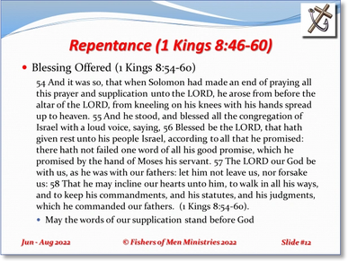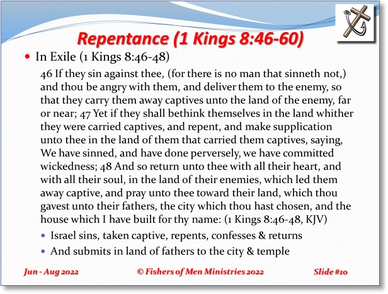 Solomon starts his case for the sinner who comes to God supposing that if there are people who sin against God, and he adds, “for there is no man that sinneth not”, he recognizes that except for God, Himself, there is no one without sin, not even one (vs, 46, Rom 3:10 & 23). So, Solomon echoes the acknowledgement that sin is universal, and the need for punishment of sin is required to draw a person back to a desire to stay holy in the eyes of the Lord. Sin might result in God allowing the sinner to be taken captive in a foreign land, whether that land is far or near, but while there, the sinner might rethink what they have done and repent of that sin and make supplication or amends for that sin by confessing, “We have sinned and have done perversely, we have committed wickedness, and so return to thess with all their heart, and with all their soul, and pray unto thee toward their land, which thou gavest unto their fathers, the city which thou hast chosen, and the house which I have built for thy name:” (vss. 47-48). The supposition is set up that the person who sinned is sent into exile because of that sin, but while he is there, he repents of that sin with all his heart and soul while he prays in the direction of the city and house God has chosen.