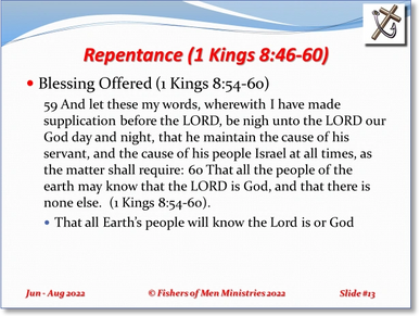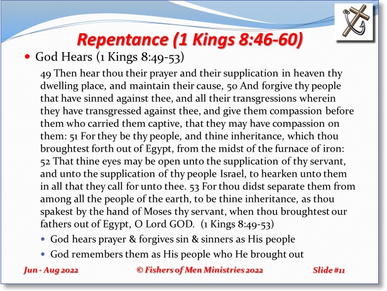 Solomon continues his supposition that God hears the prayer of the sinner as He sits in Heaven, above (vs. 49). Solomon says specifically, “Then hear thou their prayer and their supplication in heaven thy dwelling place, and maintain their case,” or support their case, “and forgive thy people that have sinned against thee, and their transgression wherein they have transgressed against thee, and give them compassion before them who carried them captive, that they may have compassion on them:” (vs. 50). Solomon sets up the case that the sinner’s repentance in that foreign land is sufficiently obvious that even the captures see it and causes them to have compassion on them.
