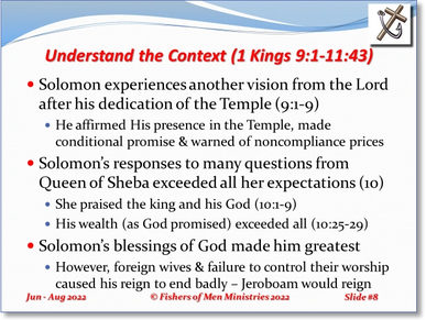 An example of the greatness of Solomon’s earlier reign is found in Chapter 10 when the Queen of Sheba became impressed by his work and came for a visit (1 Kings 10). She had nothing but praise for Solomon and the God of Israel (10:1-9). Further, his wealth exceeded that of even the richest kingdoms (10:25-29). But as obvious from above, God’s blessings were conditioned on Solomon’s living within God’s covenant.
