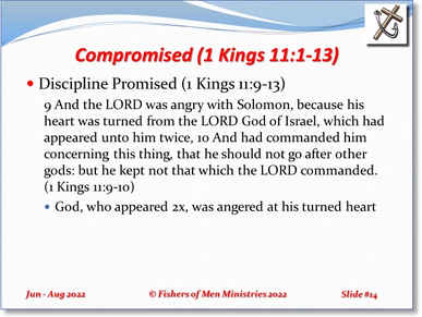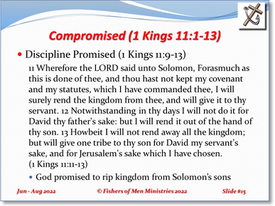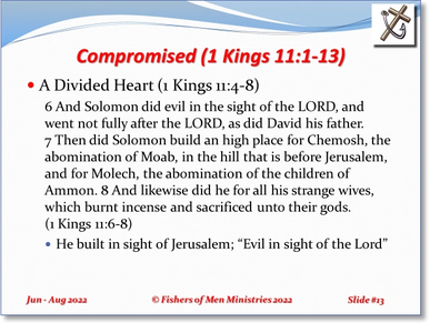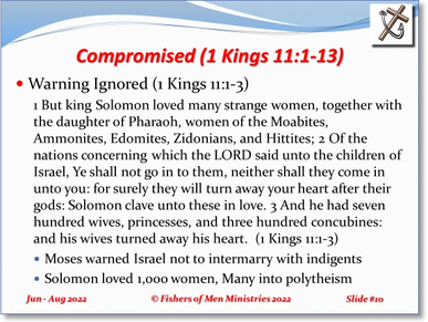 The assigned Scripture (1 Kings 11:1-13) begins with a restatement of a potential problem for Solomon going all the way back to 1 Kings 3:1. There, the author states simply, “And Solomon made affinity with Pharaoh king of Egypt, and took Pharaoh's daughter, and brought her into the city of David, until he had made an end of building his own house, and the house of the LORD, and the wall of Jerusalem round about.” Moses warned all Israel as they prepared to enter battle to acquire the Promised Land that Israel would have to attack and annihilate the inhabitants of the Promised Land as Israel came across the Jordan River (Deut 7:3-4). He was rightfully concerned that any survivors would tempt intermarriage with Israelis and result in Israel’s worship of strange gods. Solomon intermarried with those who worshipped strange gods and destroyed his testimony as a leader in Israel. His marriage with daughters or Egypt, Moab, Ammon, Edom, Zidon and Hatti were all marriages to women who worshipped false gods. Moses directed the children of Israel not to intermarry with the indigents because they would turn their hearts away from the God of Israel. As we study what happened with Solomon, the wisest man of all time, we can see the danger was real and God was correct to have Moses issue that warning. Solomon could have properly handled the situation if he demanded that all his wives and concubines worship only the God of Israel, but there is no evidence that he attempted that kind of direction.