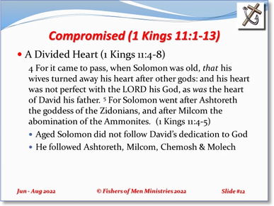 The transition between verses 7 and 8 here, show that Solomon was indiscriminately brazen in his endorsement of these false gods by erection altars in the sight of Jerusalem, burning incense and sacrificing (including children) on the hill facing the city of God’s Temple. It is clear that Solomon not only did evil in his old age, but he was evil.