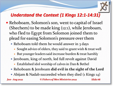 The study opens with Solomon’s son, Rehoboam, traveling to Shechem to claim the reign of all Israel. Israel had gathered there for that purpose and summoned Rehoboam (1 Kings 12:1). Jeroboam, Solomon’s servant, had fled to Egypt as Solomon attempted to kill him when he heard he might be the servant to whom God planned to give the kingdom rather than his son. So here, the leaders of Israel have summoned Rehoboam and Jeroboam to speak with Rehoboam about becoming king of Israel. I will save the rest of that discussion for today’s study below.