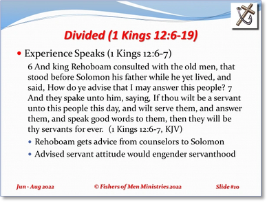 God’s prophet, Ahijah, illustrates the details of those verses in 1 Kings 11:29-40. Recall that God told Solomon earlier that the kingdom would be ripped from his sons and given to his servants. Verse 11:29 introduces the servant as Jeroboam. The prophet, Ahijah, meets him on a road and takes the new garment Ahijah was wearing and rips it into 12 pieces. He gave Jeroboam 10 pieces and kept 2 pieces for Solomon’s son, Rehoboam. This prophetic visit is exactly how God causes the nation to be divided in this week’s study of 1 Kings 12:6-19.