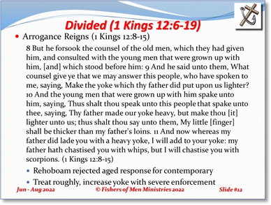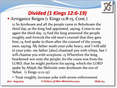 When the 3-day period of consideration was over, Jeroboam and all the people came to hear what Rehoboam had decided regarding their offer to serve him as loyal subjects in exchange for reduced burdens upon them (vs. 12). Put briefly, King Rehoboam answered the people very harshly the way the younger men suggested rather than the way Solomon’s advisors suggested (vs. 13). He added, “My father laid heavy burdens on you, but I’m going to make them even heavier! My father beat you with whips, but I will beat you with scorpions!” just as the younger men suggested (vs. 14).