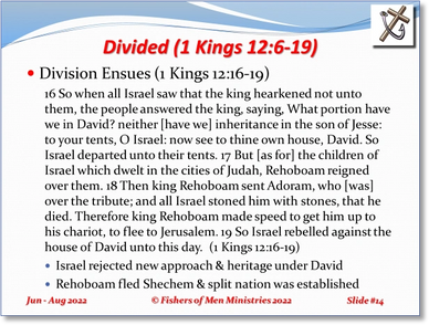 Here, God had already directed and had His prophet, Ahijah, announce exactly what was going to happen. God was going to punish Solomon for allowing the worship of and sacrificing to the false gods of his many wives and concubines by ripping the kingdom away from Solomon’s sons and giving it to his servants. In short, Jeroboam would have to leave this meeting as King over 10 tribes of Israel while Rehoboam would leave as King of 2 tribes of Israel to be called Judah. Just as in the case of the Egyptian pharaoh, God allowed Rehoboam to show his arrogance and foolish pride even though he knew God’s plan and what the results of this meeting would be. We could say, “And God hardened Rehoboam’s heart to refuse Israel’s offer to be loyal subjects to him." Rather, God’s plan was announced and the plan would be executed just as He stated it.