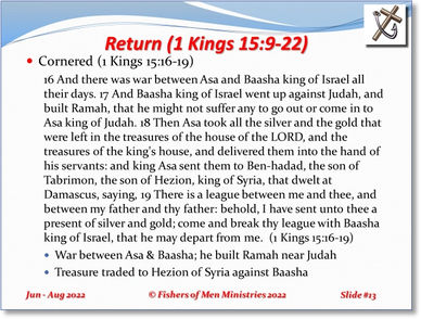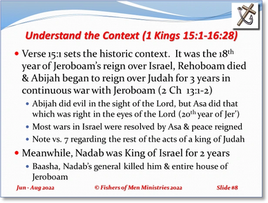 After the dust settles, we find Rehoboam, Solomon’s son, as King of Judah and Jeroboam, Solomon’s servant, King of Israel. Judah and Benjamin would make up Judah while the rest of Israel (10 tribes) would make up Israel. The year was 975 BC. Both of these kings would do evil in the sight of the Lord. Their sons, Abijam and Nadab, respectively, did evil after them
