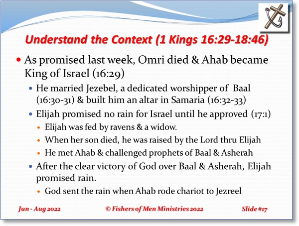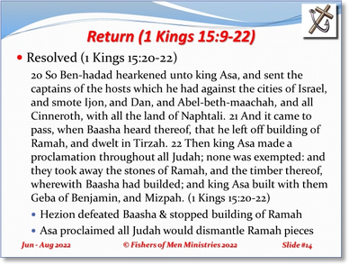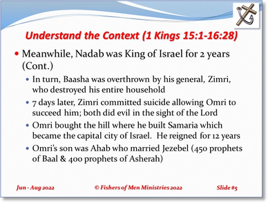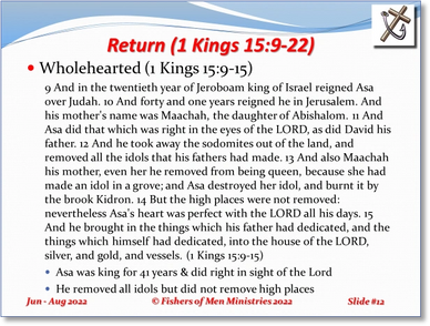 The study of 1 and 2 Kings has periods of greatness and periods of defeat for Israel. Their periods of defeat come whenever they take their eyes off their God. Their periods of greatness come when they surrender to Him, repent of their sins against Him and return to worshipping Him. There are many more periods of defeat than greatness. Much of these two Books will tell of how Israel left their worship of the Lord for false gods and real devils. It shows how God’s chosen turned against Him more often than turning toward Him. Approximately one king of even ten walked in the ways of his Lord while all the others walked not after the Lord, their God. Those words will be found at the introduction of each of the kings.