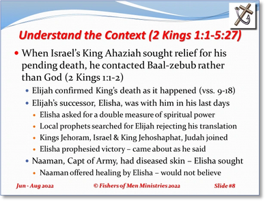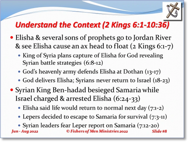 The context for this study traverses five chapters in 2 Kings. They are 2 Kings 6 – 10. Elisha the Prophet occupies the lead role for each the stories associated with these chapters. First, he travels with several of the sons of prophets to visit the Jordan River. There, Elisha causes an ax head to float at the amazement of all attending (2 Kings 6:1-7). All attending the event realize that the floating of an item with the density of an ax head should be impossible to explain. Here, the explanation is to introduce the work of Elisha as the work of a Man of God.