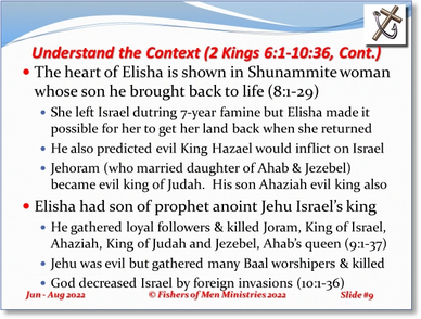 Chapter 8 reveals some of the feelings of Elisha’s heart. Earlier, he had brought a Shunammite woman’s son back to life. She remained in Israel but found herself in a 7-year famine in that city. She left Israel for Syria but wished to return after the famine was over. Elisha told the lady that he would make it possible for her to return and regain possession of all her previously held real estate.