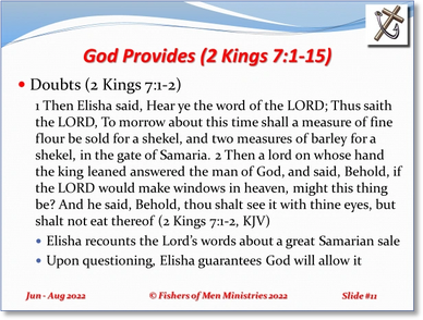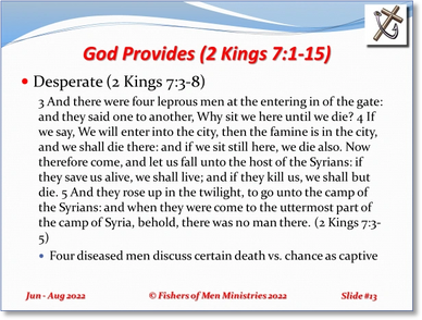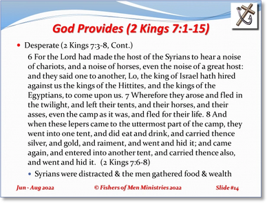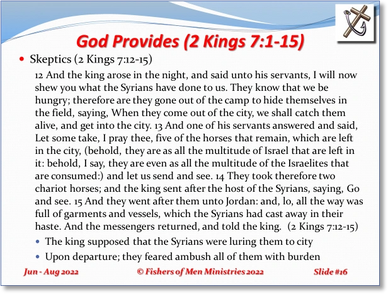 Next, we see four men with diseases (probably leprosy) were discussing an escape to Samaria for food and water (7:3-11). They find the city totally empty of soldiers and citizens, so they help themselves to all the food and water they could hold and return to report the abundance of supplies in the city but the absence of any law to prevent taking of the plenty. The Syrian leaders hear the report but fear the leper’s report might be a trap to get their soldiers to enter the city oly to face an ambush of Samarian soldiers.