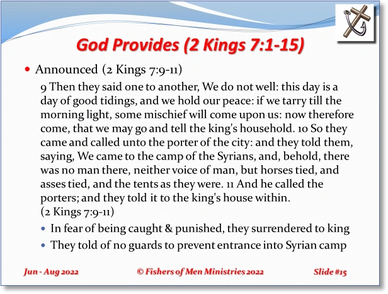 So, the king allowed two chariots to be prepared with horses and scouts to go into the Syrian encampment to see what happened to the Syrian army (vs. 14). The scouts went all the way to the River of Jordan and found nothing but a trail of clothing and equipment the Syrians had thrown away in their mad rush to escape from the noise of the massive army they thought they had heard while in their camp. The King’s scouts returned to brief the King on all they have seen.