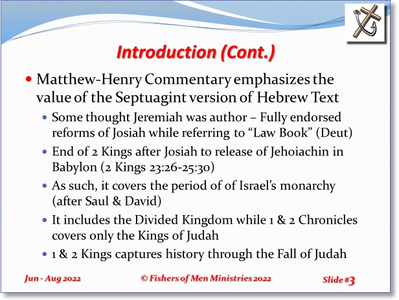 The Matthew-Henry Commentary joins those who reference this Chief Storyteller or Historian as writing during the period of 621-609 BC. They offer the completion of the text to have been done in 550 BC after the destruction of Jerusalem while in Judah's captivity in Babylon. This concluding material documented Israel's history from the death of Josiah until the release of Jehoiachin in Babylon (2 Kings 23:26-25:30).