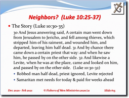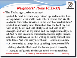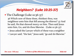 Jesus recognized the lawyer was quoting the Scriptures and said, you have answered correctly. He added, “This do, and thou shalt live” (vs. 28). But this was not the intent of the lawyer. He was not there to compare knowledge of the Scriptures with the Master, rather, he was there to challenge the Master and have Him say something that might result in charges of blasphemy. So, the lawyer continued, “Who is my neighbor?”