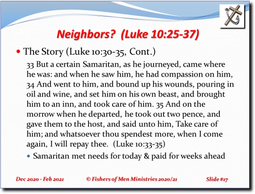 Of course, these two small pieces of the Law are no less impossible to live fully than any other parts of it. No one can love God this thoroughly nor can any person love his neighbor as himself. But the intent of the Law is to guide our steps with lofty goals so that we will gain strength by continuously trying to reach that level of commitment to God and others. So, the lawyer, trying to make points with those watching, asks, “And who is my neighbor?”