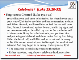 But the father had prayed for the return of his son and forgave him even while he prayed. He only wanted his son to come back, and here he was! So, the father said to the servants, “Bring forth the best robe, and put it on him; and put a ring on his hand, and shoes on his feet: And bring hither the fatted calf, and kill it; and let us eat, and be merry: For this my son was dead, and is alive again; he was lost, and is found. And they began to be merry” (15:22-24).