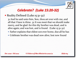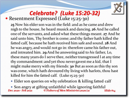 Verse 27 has the servant’s response, “Thy brother is come; and thy father hath killed the fatted calf, because he hath received him safe and sound” (KJV). The elder son was livid at the father! (15:28). When the father asked him what was wrong, the elder son unloaded, “Lo, these many years do I serve thee, neither transgressed I at any time thy commandment: and yet thou never gavest me a kid, that I might make merry with my friends: But as soon as this thy son was come, which hath devoured thy living with harlots, thou hast killed for him the fatted calf! (Luke 15:29-30).