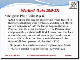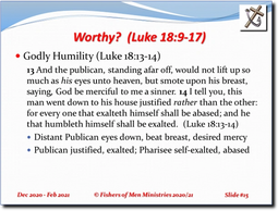 The Publican, on the other hand, is most hated of all men. He collects the taxes for Rome and local authorities and applies their unjust burdens on everyone he taxes. He is known to pad the requirement somewhat to enhance his own standard of living. So, he is believed to be an extortioner, a thief and a traitor. But as these two begin to pray, more is learned about where their hearts are.