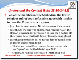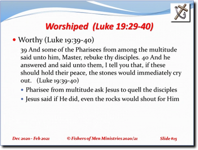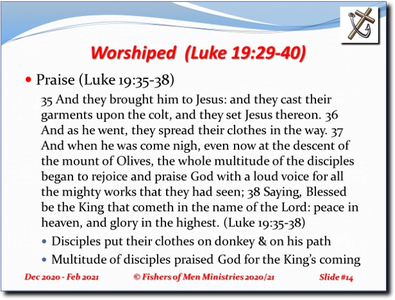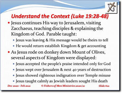 The second part of establishing the context for this study summarizes the four aspects of Jesus’ actions for the Kingdom during the last days of His ministry. As He entered Jerusalem on the donkey that day, Jesus accepted the praise of the people which was given as unto the Lord. He was acknowledging He was the Lord’s Messiah. He wept over Jerusalem as He saw in His mind’s eye its destruction over the next 40 years (ref: 70 AD). He showed righteous anger over the misuse of His Temple (He was the Lord’s Messiah). And He taught the final lessons to His disciples calmly even though He knew what was about to happen to Him. As the centurion in charge of His crucifixion said at His death, “Truly, this man was the Son of God” (Matt 27:54 & Mark 15:39).