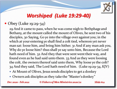 These verses document Jesus’ instructions to two of His disciples to go ahead of the others into the outskirts of Jerusalem to collect a donkey for His Triumphant Entry. He tells them about a colt of a donkey which they will find at a certain home. The donkey had never been ridden. Jesus said if the owner questions their taking of the animal, they should simply say the Lord has need of it. The word Jesus told them to use for the Lord was the Greek word kyrios which means Lord, God or Master. The message to the colt’s owner would be compelling and direct. The act of Jesus riding this donkey is prophesied by Zechariah 9:9 as, “Rejoice greatly, Daughter Zion! Shout, Daughter Jerusalem! See, your king comes to you, righteous and victorious, lowly and riding on a donkey, on a colt, the foal of a donkey.” The One the Jews of Jerusalem was waiting for would be declared as Messiah that day – Palm Sunday, April 6, 32 AD.