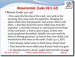 The Scriptures we reviewed in Psalms 22 and Isaiah 53 provided literal evidence of the suffering and shame the Messiah would face in the rejection of sinners. Another Psalm of David predicts the resurrection by saying, “For thou wilt not leave my soul in hell; neither wilt thou suffer thine Holy One to see corruption” (Psalms 16:10). This passage is referenced twice by Luke to explain the Old Testament prophecy that Jesus would raise from the dead before He could begin decaying (Acts 2:27, 13:35). Recall the doubt that Lazarus could be raised from the dead because he had been dead four days. Jesus would not be in the grave that long. He said, “For as Jonas was three days and three nights in the whale's belly; so shall the Son of man be three days and three nights in the heart of the earth” (Matt 12:40).