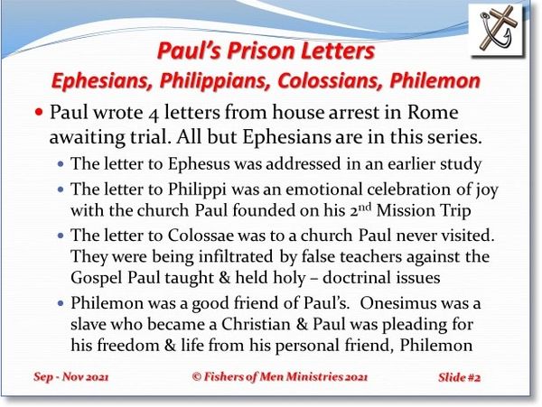 These are top-level outlines for three of Paul's four letters written during his imprisonment. Philippians will be presented first with Colossians and Philemon to follow.