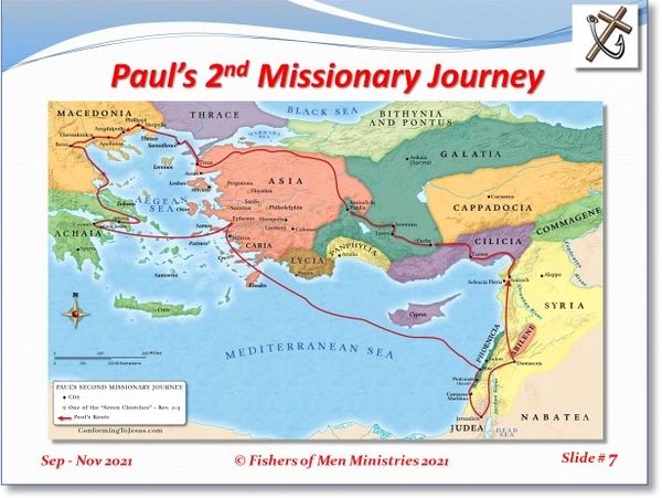 Paul had three missionary journeys as documented in the last few chapters of the Acts of the Apostles. The second of these took place in AD 51 (Acts 15:36). The map to the right shows the path of that journey. Paul originated the trip from Damascus and departed for Cilicia from Syrian Antioch.