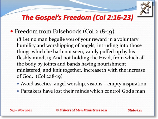 Paul continues his very strongly worded warnings by saying that we should not let any person come among us and trick us into losing our reward for voluntary humility (service) or convince us to worship angels based on their visions or dreams they claimed to receive. The English Standard Version uses words more directly linked to the study underway. It states, “Let no one disqualify you, insisting on asceticism and worship of angels, going on in detail about visions, puffed up without reason by his sensuous mind” (Col 2:18). It is a proper caution that we could lose our qualifications for teaching God’s Word by teaching things based on visions and dreams of others instead of Sola Scriptura (the Scriptures alone).