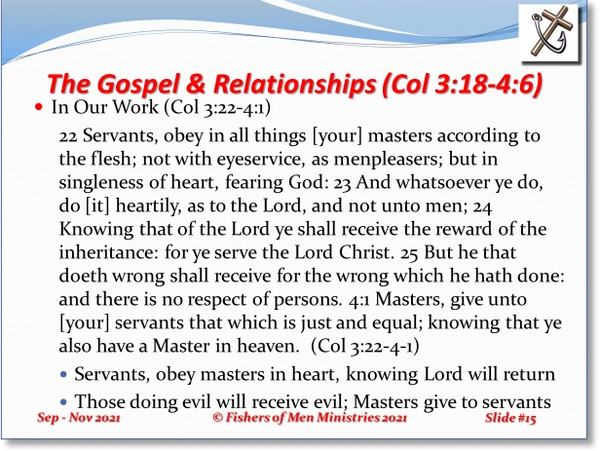 In verses 3:22 to 4:1, Paul describes the kinds of behaviors he thinks would be common to born-again believers as they interact in the workplace environment. The people Paul first introduces in these verses are called servants. The literal meaning of “servants” is in the Greek word, doûlos which means slaves. The definition is sufficiently wide to mean “slave” literally or figuratively. It could also include people who are in some kind of formal subjection or submissive role relative to a master or owner, as mentioned in verse 3:22.