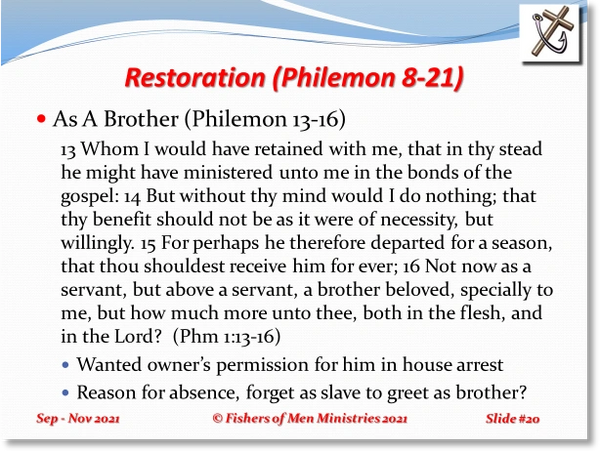 So, Paul correctly tells Philemon that he would do nothing more with Onesimus until Philemon decided what was right from his perspective. Onesimus belonged to Philemon, and Paul could not bring himself to take him from Philemon without Philemon deciding on that action for himself. In fact, it seemed to Paul, it might be that Philemon had lost Onesimus for a short period to get him back as a much improved person (product) forever.