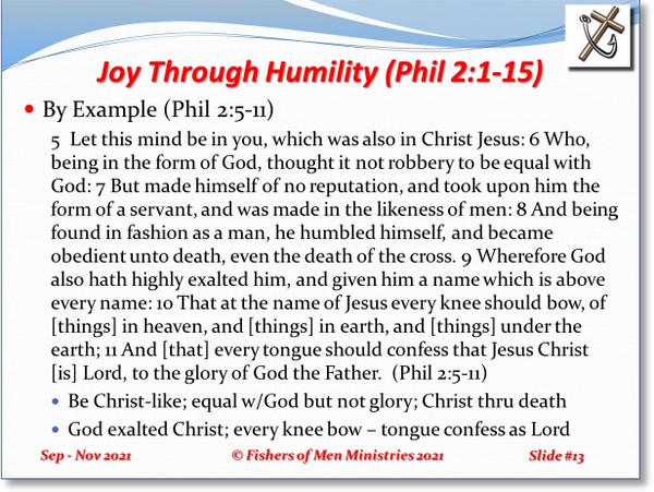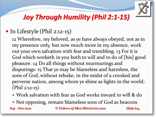 Last, we look at Joy Through Humility In Lifestyle (Philippians 2:12-15). When Paul thinks of the people of the Philippian Church, he recalls how perfectly obedient they have been. Paul testifies that they have not only been fully obedient while he was there with them, but when he was not with them, as well. The end of verse 12 says in the KJV that they should “work out their own salvation.” Of course, those who believe that there is some human works that you must do to be saved (born again), will look at this verse as evidence and justification of their beliefs. The same people will fail to remember that this same Paul made the opposite abundantly clear when he said, “8 For by grace are ye saved through faith; and that not of yourselves: [it is] the gift of God: 9 Not of works, lest any man should boast” (Eph 2:8-9).
