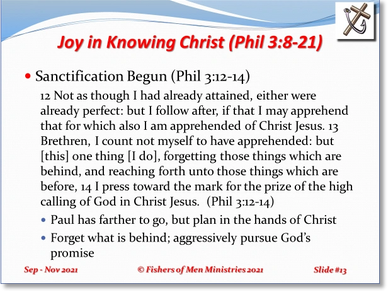 Paul reminds us, however, that the acquisition of this saving grace through faith in Jesus Christ is just the beginning of his walk in Him (vs. 12). Therefore, Paul had not already achieved all there was to have through Jesus Crist. While he had been saved from the penalty of sin through his faith, he had not completed the course of had become perfect in it. Paul realized that being saved from the penalty of sin, was not sufficient for day that day of living in Christ. After this justification or saving from the penalty of sin, Paul must acquire the lifelong goal of becoming holy and acceptable God in Christ. Sanctification is salvation from the power of sin and does not end until we are taken home by Jesus Christ. While Paul was attempting to achieve this Christlikeness, he was convinced that Christ was also apprehending himself to give him that Christlikeness. God’s toolkit for causing humankind to grow are the trials and tribulation we are to joyously respond to in order to achieve such growth.