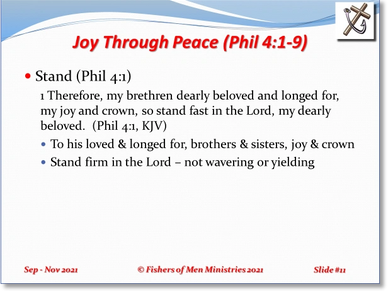 Paul opens his discussion of joy through peace by saying that because of our sure salvation in Christ, as presented at the end of Chapter 3 (therefore), those who are of that intensity of faith in Christ, ought to stand or persevere firmly in the Lord. Notice how succinctly and carefully he addresses the intended recipients of the command. First, he calls them “My brethren” indicating that are fellow believers with him in Jesus Christ. This salutation is especially needful because Paul was a noted leader of Jews and this church is mainly Gentile, nevertheless, they are his brothers. Then he calls them “dearly beloved and longed for.” So, they are dearly loved by him and the Lord, and they have a great and joint desire to be where they are, to be with them.