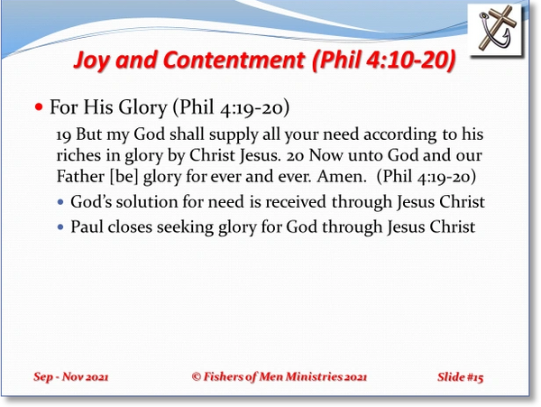 The study of Paul’s letter to the Church at Philippi is a study of Christian joy in the Lord. Our weekly studies have been dubbed “Joy in Prayer” (Chap 1a), “Joy of Adversity” (Chap 1b), “Joy Through Humility” (Chap 2), and “Joy in Knowing Jesus” (Chap 3). During last week’s study, we looked at the joy related to trials and tribulations during our service for the Lord. Philippians 3 began with Paul’s exhortation, “Finally, my brethren, rejoice in the Lord” (Phil 3:1). Paul then described how he was motivated before his Christian conversion by the laws and rituals of the Jewish faith just as the Judaizers practiced. This week in Chapter 4, he warns the Philippians to disregard the doctrines of the Judaizers.
