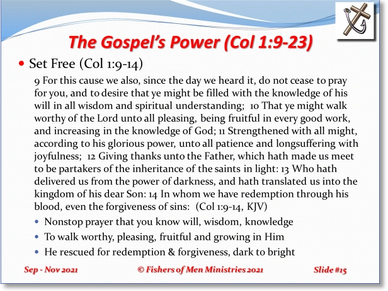 At this point, Paul’s letter to the saints at Colosse is more easily described relative to all four chapters than in pieces. Chapter 1 presented the power of the Gospel to emancipate and transform repentant sinners. The word “emancipate” leans toward freeing those held in bondage; i.e., President Lincoln’s Emancipation Proclamation is that document freeing those in slavery in the early history of our country. Colossians refers to those caught in bondage or slavery to sin. But here, setting us slaves free from sin is not enough in itself. There must be some tool or power that takes us from the freedom from the penalty of sin to some new existence which prevents us from falling back into that slavery. That is where the word “transformation” plays a role. Paul makes it easily understood in his letter to the believers at Rome when he says, “1 I beseech you therefore, brethren, by the mercies of God, that ye present your bodies a living sacrifice, holy, acceptable unto God, [which is] your reasonable service. 2 And be not conformed to this world: but be ye transformed by the renewing of your mind, that ye may prove what [is] that good, and acceptable, and perfect, will of God” (Rom 12:1-2). As we turn from conforming to this world by continuing in servitude to the sin habits, we experience the transforming power of the Holy Spirit by His new presence and power inside of us. So, we can be freed from sin to be transformed by renewing our minds in Jesus Christ.