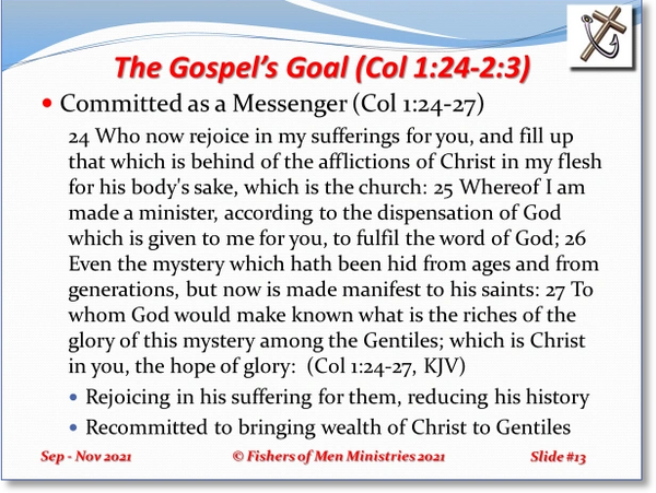 He wants to watch their faces as they hear and react to the comforting of their hearts from the teaching of the Gospel of Christ. People hurt so needlessly as they live rejecting Jesus Christ. The denial of the most important relationship for all humankind is very destructive to the human basic needs (spirit). It even transcends the love we have for our mothers and fathers; the rejection of God or Jesus Christ is rejection of the simple existence of the One Who created us. He is Father indeed, and in Him are hidden all the treasures of wisdom and knowledge of the Father, Son and Holy Spirit. The word “mystery” in verse 2:2 is the Greek word mystḗrion which means; a secret or "mystery" (through the idea of silence imposed by initiation into religious rites): mystery: literally “to shut my mouth”. The secrets of the faith are not secrets because someone wants to keep them unknown, but they are secrets because the enemy does not want them revealed and will confuse or distract the mind and heart of humankind to prevent them from being heard and explained. Paul knows this more than any person. Read of what the enemy has done to him in order to keep him from presenting the Gospel openly: “21 I speak as concerning reproach, as though we had been weak. Howbeit whereinsoever any is bold, (I speak foolishly,) I am bold also. 22 Are they Hebrews? so [am] I. Are they Israelites? so [am] I. Are they the seed of Abraham? so [am] I. 23 Are they ministers of Christ? (I speak as a fool) I [am] more; in labours more abundant, in stripes above measure, in prisons more frequent, in deaths oft. 24 Of the Jews five times received I forty [stripes] save one. 25 Thrice was I beaten with rods, once was I stoned, thrice I suffered shipwreck, a night and a day I have been in the deep; 26 [In] journeyings often, [in] perils of waters, [in] perils of robbers, [in] perils by [mine own] countrymen, [in] perils by the heathen, [in] perils in the city, [in] perils in the wilderness, [in] perils in the sea, [in] perils among false brethren; 27 In weariness and painfulness, in watchings often, in hunger and thirst, in fastings often, in cold and nakedness. 28 Beside those things that are without, that which cometh upon me daily, the care of all the churches” (2 Co 11:21-28, KJV).