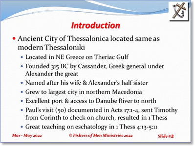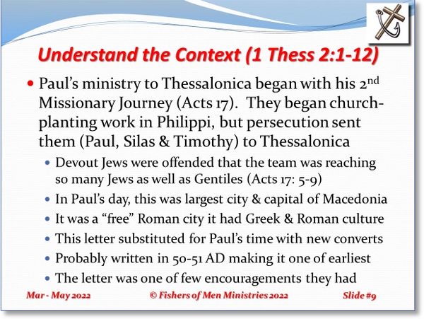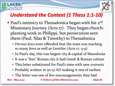 The context for the opening study in 1 Thessalonians is, in fact, the history of the founding of the church. It was 50-51 AD when Paul’s Second Missionary Journey took him to the province of Macedonia (Acts 17). Thessalonica was the largest city in Macedonia in Paul’s days, and it was the capital city of the Province of Macedonia. The leadership team for this journey was made up of Paul, Silas and Timothy. The Apostle Paul was the leader. Silas joined the team in place of Barnabas who was with Paul on the First Missionary Journey but left the team before the mission was completed. Timothy was a fairly recent convert to Christianity through Paul’s earlier ministry and was being discipled on this trip. The combination of these three was highly motivated, evangelistically energized team dedicated to advancing the cause of Jesus Christ despite any opposition they might find in the mission field.