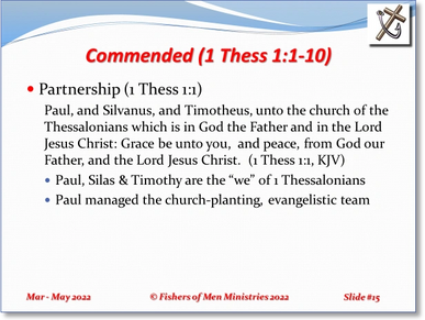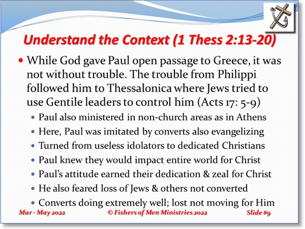 The character of Paul’s first visit to Thessalonica was presented in the earlier discussion. It lasted about three weeks before the devout Jews made an organized move to capture him to kill or imprison to shut his ministry down. While there, they also had some time to get into other areas of life in the city, e.g., markets, other synagogues, schools, private homes and workplaces to share the Gospel with people outside the target synagogue. The work was extremely fruitful, but the aggressive anger of the devout Jews caused a very short stay before Paul and his team being forced out of the city. While they won an extraordinary number of Jews and Gentiles to Jesus Christ, but their forced exit left little time for organized discipleship. So, Paul wrote this letter (1 Thessalonians) as a very quick turn-around effort to do some of that discipleship. Each chapter of First and Second Thessalonians is packed with beginning level discipleship materials.