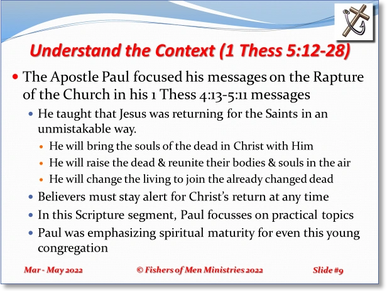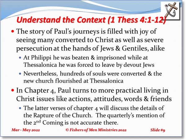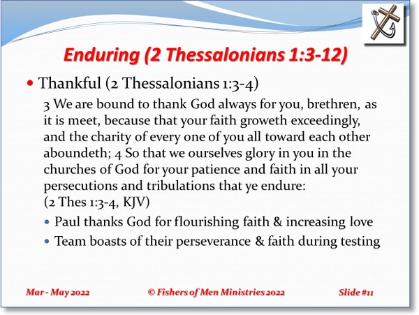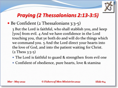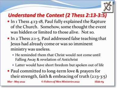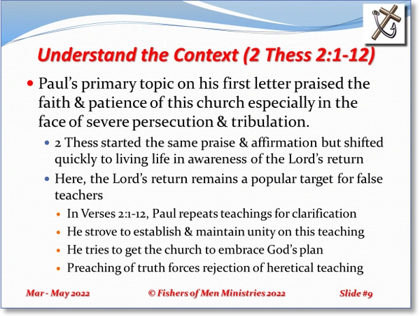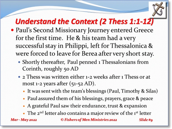 The last section establishing the context of our study for today is Paul’s commitment to the long-term love and prayer for the continued strength of the Thessalonian Christians. In their short lives as a church, they would become internationally known for their love, faith and perseverance in the face of terrible persecution. Paul prays that their standard for strength, faith and embracing of truth would become the church’s standard throughout God’s realm (2 Thess 3:1-5).
