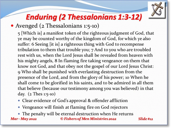Paul assures the Thessalonians that they can find rest him and the other leaders of the missionary team as they look forward to the Lord being revealed from Heaven at His return in power with His mighty angels. It will be at this time that vengeance will find the persecutors who do not know God and will not receive the Gospel of Jesus Christ. He will then show them their everlasting destruction in their complete separation from the Lord and His glorious power forever (vss7-8). During the same time, God is visiting vengeance on the unbelievers, He will come in glory with His saints to be admired of all those who believe because they accepted the truth of the Gospel of Jesus Christ Paul shared with them during that earlier time (vs. 10).