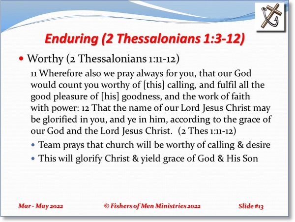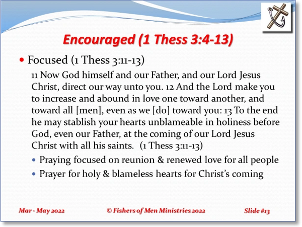 After asking God to direct our paths, Paul asks the Lord’s blessing on our ministries in verse 12. He asks that we experience ministerial growth in how we love one another and all others just as Paul showed his love toward the saints at Thessalonica. To get the full impact of this request, we should think back over the last two bullets in this presentation to see how absolutely elated Paul gets when he receives Timothy’s report of how the love for one another, love for others and desire to see Paul again. He even says that the definition of life (for him) is to know they are standing firm in Jesus Christ (vs. 8).