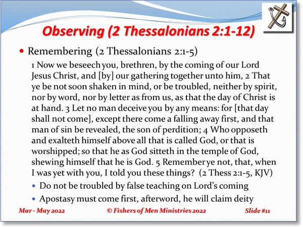 Second Thessalonians 2:1-2 states the issue right up front. Paul strongly encourages the church members saying, “Now, dear brothers and sisters, let us clarify some things about the coming of our Lord Jesus Christ, and how we will be gathered to meet him. [Do not] be so easily shaken or alarmed by those who say that the day of the Lord has already begun. [Do not] believe them, even if they claim to have had a spiritual vision, a revelation, or a letter supposedly from us” (2 Thess 2:1-2, NLT). The false teaching, regardless of its source, alarmed the church because it implied that the coming of the Lord about to happen (Barnes & Ellicott Commentaries). Paul’s clarification comes in verse 3. There are at least two things that need to happen before the Lord would return. The first was a great falling away from the faith, and the second was the revealing of the man of sin or the son of perdition. It would be obvious to the Thessalonians that there was no great turning away from the faith; to the contrary, their church was growing by leaps and bounds and the excitement of continuing in that growth showed no change for the foreseeable future. The man of sin and son of perdition are names for the Antichrist, and there were no matches for this man’s characteristics in Paul’s latter description (vs. 4). Barnes Commentary says, “When that time should come, then that ‘wicked’ one would be revealed with such an impact that he could not be mistaken for anyone else.”