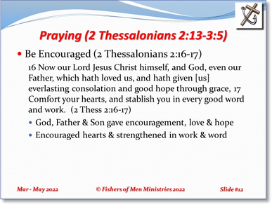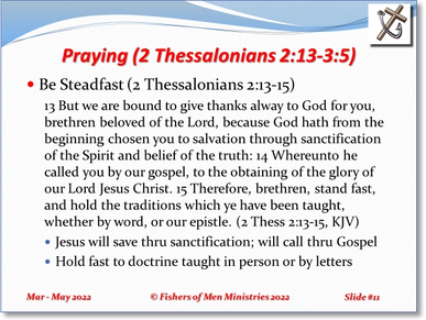 Paul finished the 14th verse by saying it is this kind of sanctification that pushes through to the believers’ obtaining or sharing in the glory of our Lord Jesus Christ. Paul’s exhortation is simply, “Therefore, brethren, stand fast, and hold the traditions which ye have been taught, whether by word (when the Team was with them) or our epistle (which was written shortly thereafter) when the team moved on” (vs 15, author parentheses).