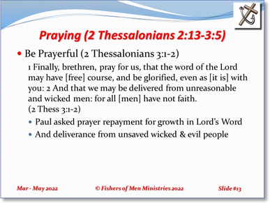 Second Thessalonians 2:13 begins Paul’s focus on praising and encouraging the church at Thessalonica. By now we know and recognize Paul’s methodology for building up churches and encouraging them to do more of the great things they were doing while holding fast to the high standards Jesus set for churches and individuals. First, he wants every member of that new Thessalonian church to know that the leadership of Christianity is dedicated to prayer for their specific needs as a young church. He recognizes them as brothers in Christ, and as such, beloved of the Lord. Paul says that his missionary team thanks God that He chose the Thessalonians to be among the first to experience salvation in their region. It was “to salvation through sanctification of the Spirit and belief of the truth” (2 Thess 2:13b). Jamieson, Fausset & Brown say the word “But” in verse 13 is in delightful contrast to the damnation of the lost in verse 12 (2 Thess 2:12-13) and where the "salvation" of Paul's converts securely stand.