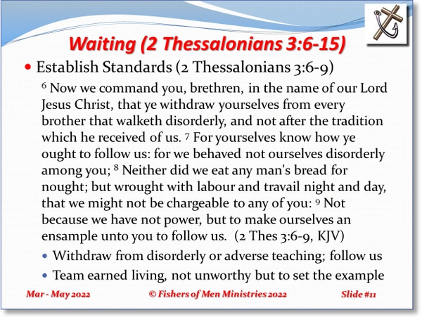 Paul says the Thessalonians saw their example firsthand how the team never behaved in a disorderly or idle way while they served during the founding of the church. He details what that meant in verse 8 that they never ate anything without paying for it. Further, they worked and ministered day and night in order to keep from being a burden or become chargeable to any person in the church for anything. Paul explains that this was not done because of any legal document or practice, but rather, in order to have their labor count toward the founding and building of the Church of Jesus Christ, and not for any person or entity (vs. 10). The intended ministry was to establish the church and train the people to do the various works of the church to have them become independent without any burden to the Church at Jerusalem because they were taking collections for their own survival and were not able to support the new churches.
