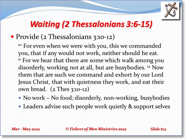 Paul starts off with a very significant standard, “If any would not work, neither should he eat” (2 Thess 3:10). He reflects on an earlier time when he was able to stay with the new church just a few weeks. They had the same standard then. and the successes from it makes it sound a lot less harsh. Paul adds more motivation for it in verses 11 and 12. Verse 11 says that Paul has heard there are reasons to continue the standard. He has advance notice that there remains “some which walk among you disorderly, not working at all, but are busybodies” (2 Thess 3:11).